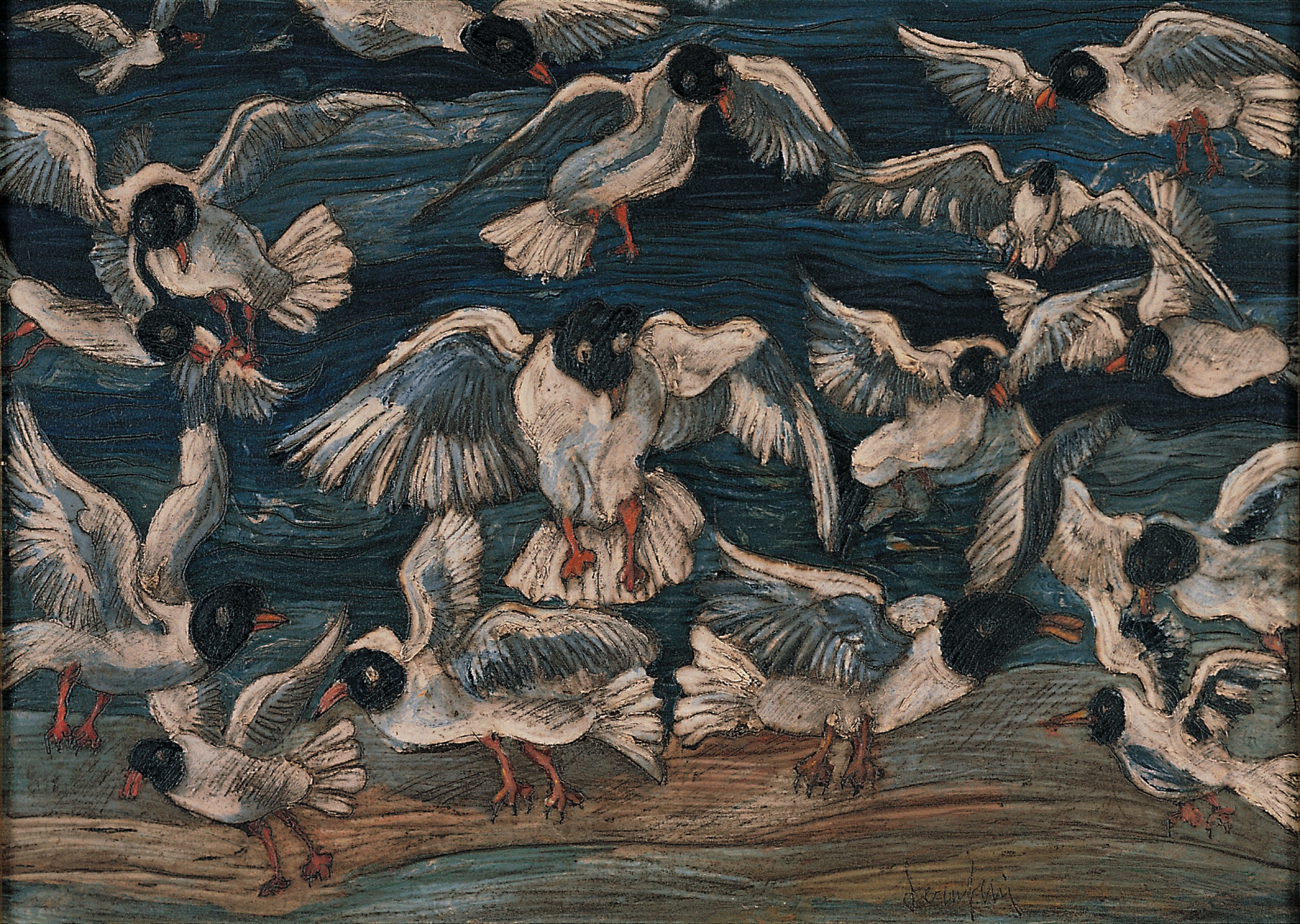 Gabbiani Beppe Serafini Oggetto Dipinto Secolo XX sec. (seconda metà) Materia e tecnica olio e incisioni su cartone Misure 50 x 70 cm